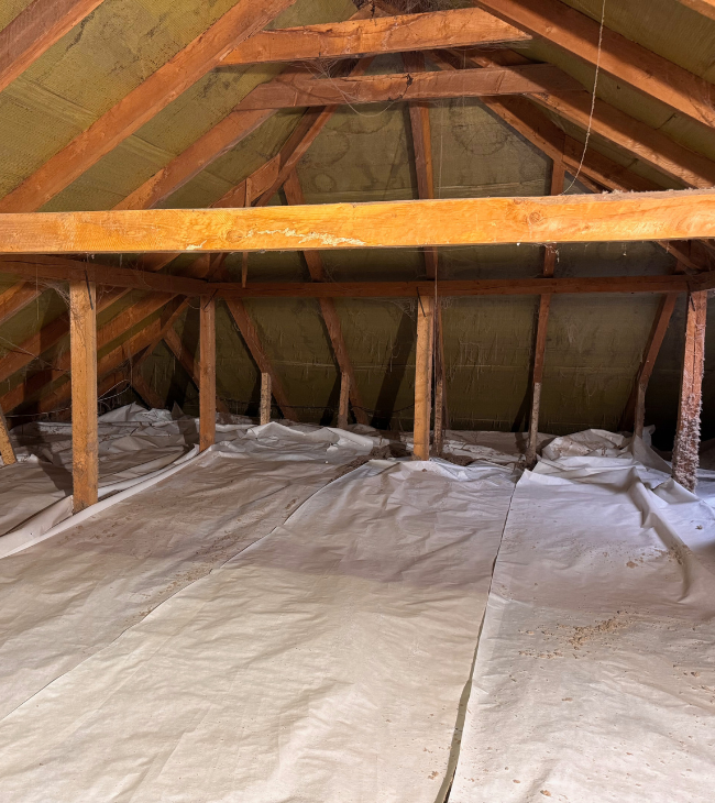 A kivitelezést fújt üveggyapottal történik, 27,5 cm-es vastagságban, melynek köszönhetően, akár 20-30%-os energiamegtakarítást érhetünk el! A befúvásos technológia legfőbb tulajdonsága, hogy egy illesztés és hőhídmentes szigetelést kapunk, ami nagy előny a táblás szigetelőanyagokkal szemben.